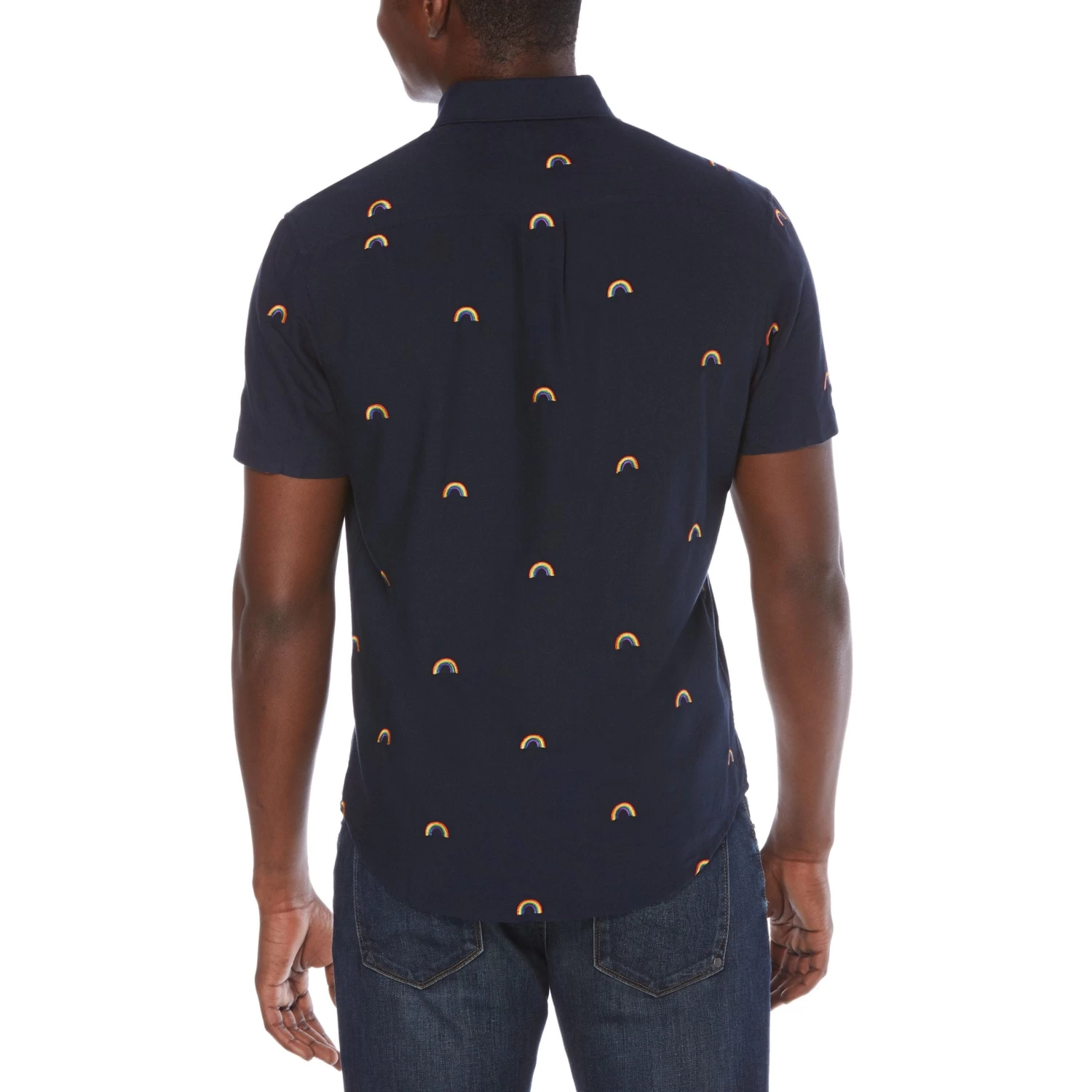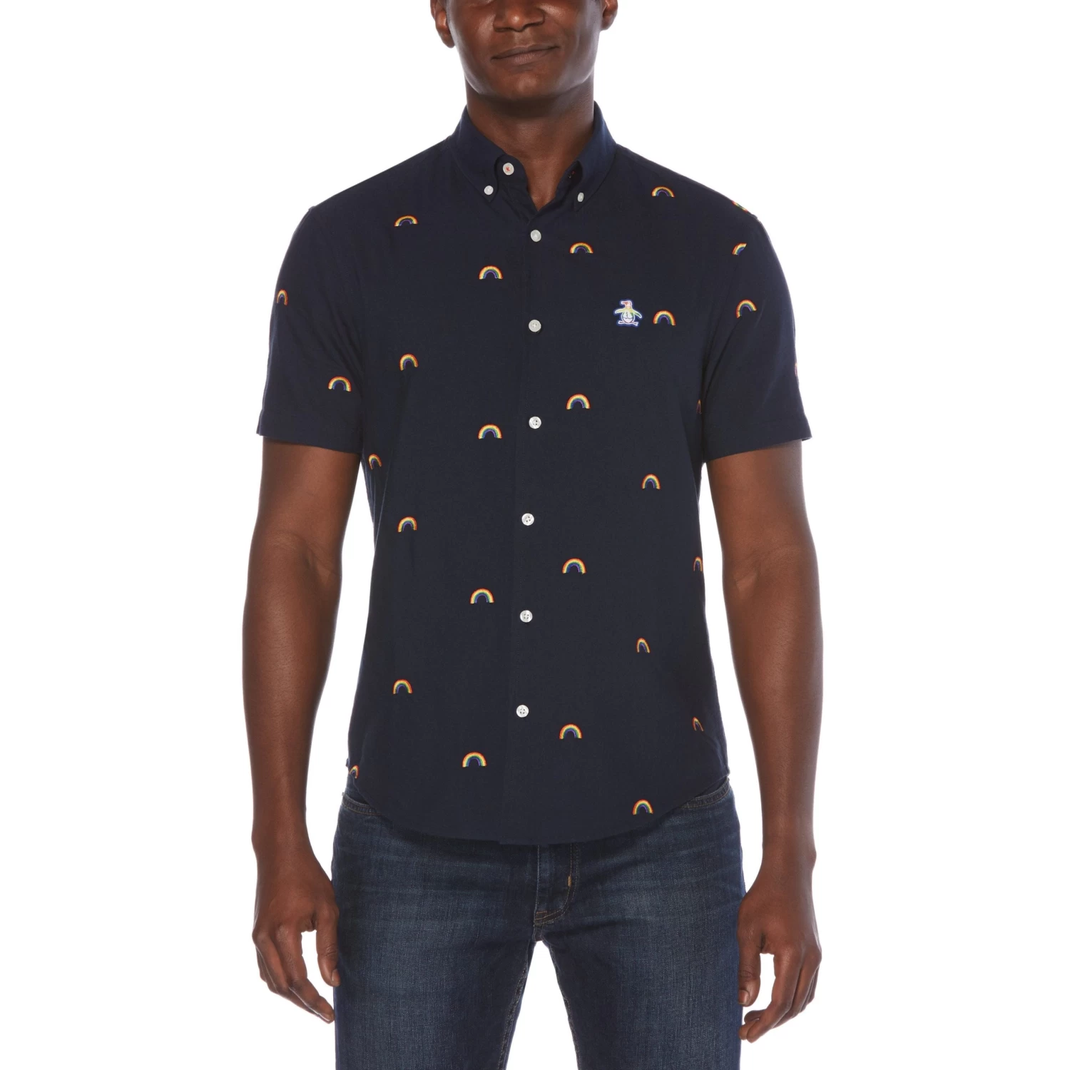 A cheerful pride rainbow print brings pizzazz to this Original Penguin men’s short sleeve shirt. Oxford fabrication backs it up with a durable and distinctive weave. Combining strength and sporty style in a breathable button-down shirt, it’s a prime choice for a fabulous wardrobe.