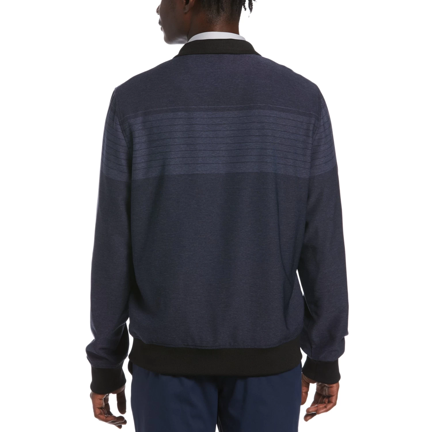 Keep your game on course in cooler temperatures with this Original Penguin golf jacket. Dobby fabrication weaves in a subtle geometric pattern, while a two-tone pattern adds visual pop. Stretch in the fabric keeps the comfortable jacket from holding you back. Fitted cuffs and hem and a high neck keep out the wind, and a full zip front makes it easy to remove when the weather warms up.